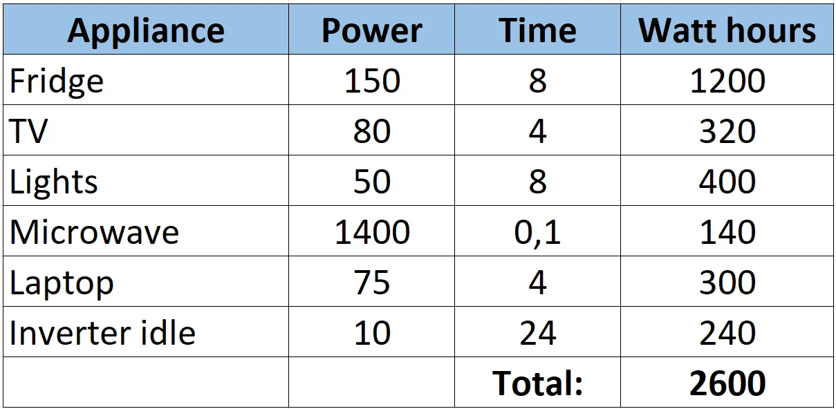 A total of 2,600Wh consumption per day and three days of autonomy gives us 7,600Wh of required battery capacity.