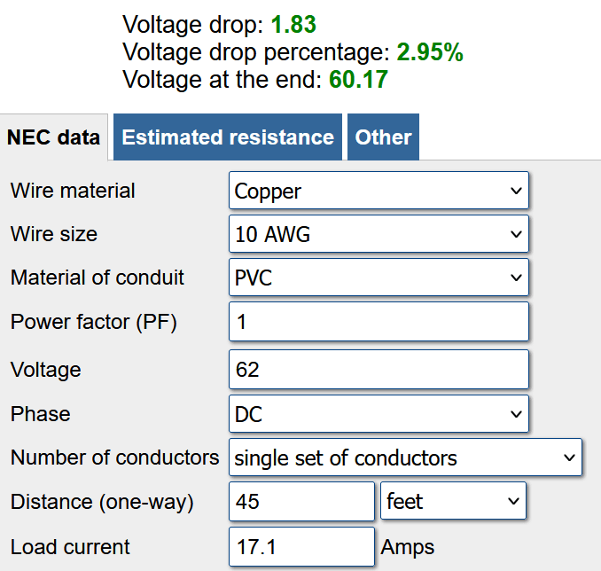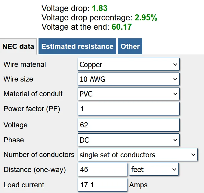 I’m using this voltage drop calculator. I enter a cable length of 45ft, and the voltage is Vmp multiplied by 2 panels. So that becomes 31V x 2= 62V. And the current is the Isc multiplied by a safety factor of 1.25. So that becomes 13.68 x 1.25=17.1A. As we can see from the image, we can use 10AWG or 6mm². Let’s check if this wire can carry the calculated current. To figure out the max current in this cable we need to add another safety factor for hot weather (because this is an outdoor cable). So the Isc x 1.56= 21.3A. And if we go look at the resources, a 10AWG cable can carry a max of 40A, so we are good here (PV cable is rated at 90°C).