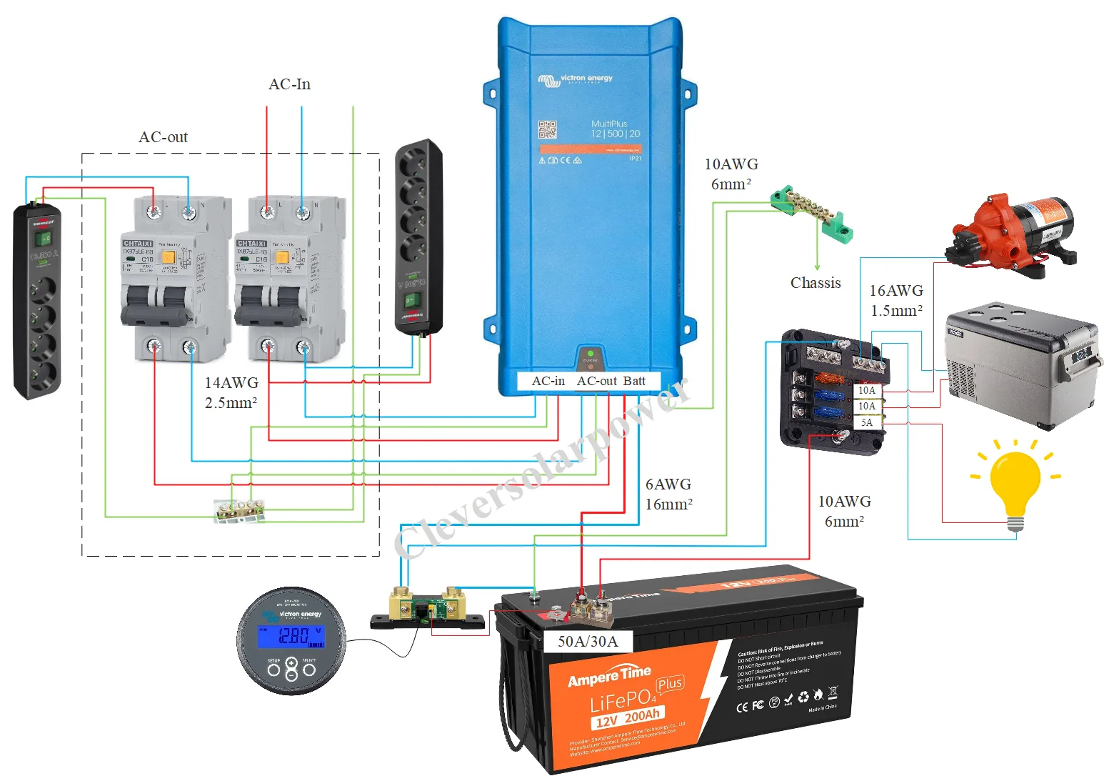 This system is very easy to install and features a small inverter/charger for charging with shore power. It has AC out for a laptop and DC out for a water pump, lights and a DC fridge. So all the essentials are covered.