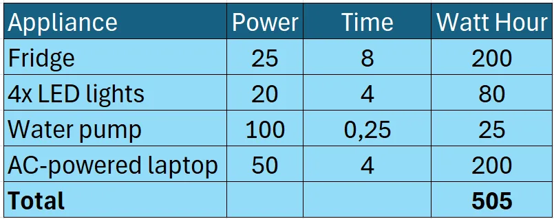 I designed this system to run for 5 days without any recharging. This is what you can run daily: