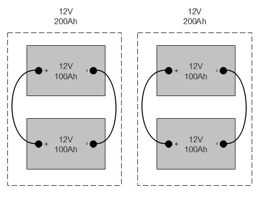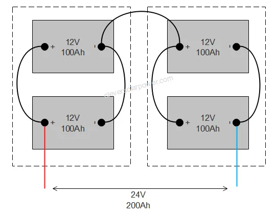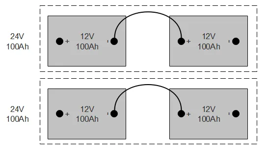 If we connect two batteries in series, we make two sets of 24V, 100Ah batteries.