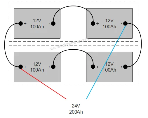 To connect four 12V, 100Ah batteries to make 24 Volts, we first connect two batteries in series.