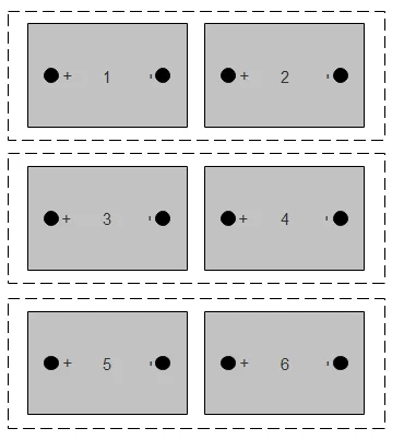 - Connect the batteries in each group in series: Connect the negative terminal of Battery 1 to the positive terminal of Battery 2.