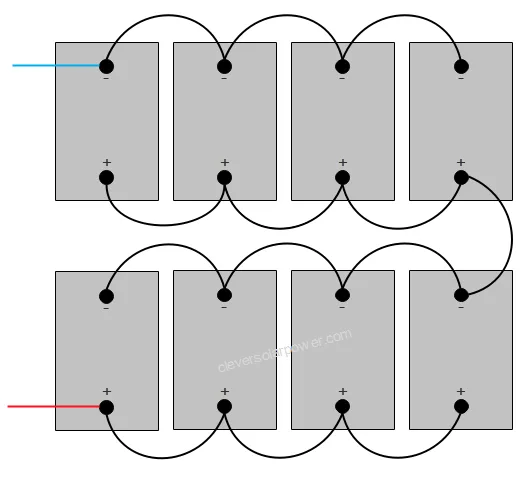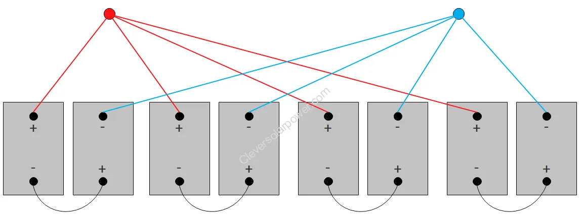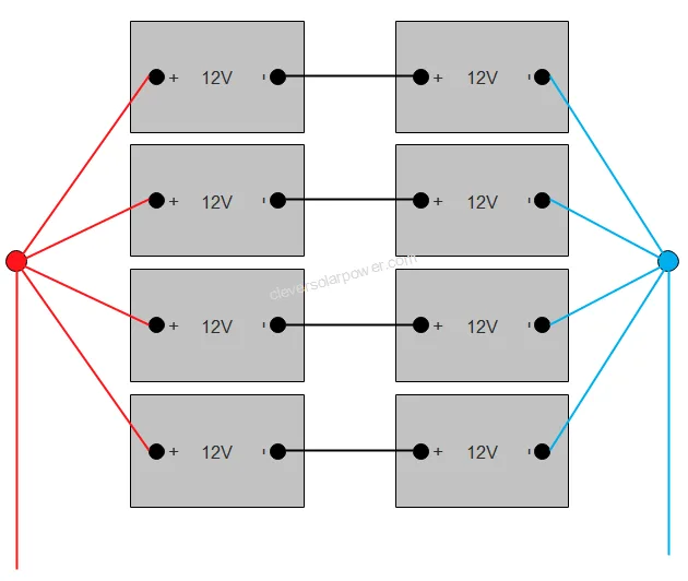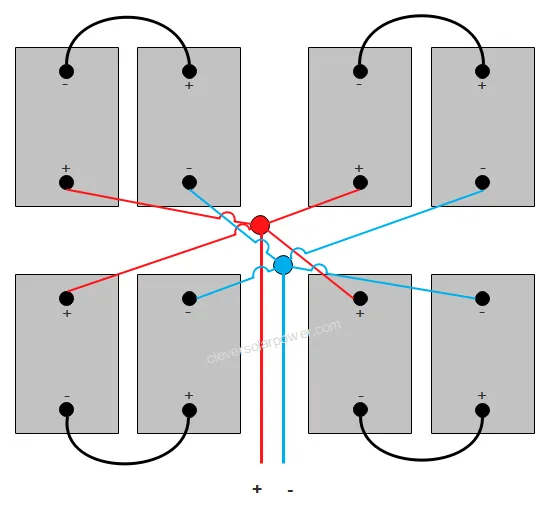Another configuration shows the connection of 8 batteries in one line. First connected in series, then in parallel.
