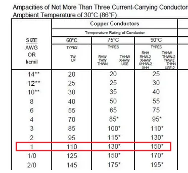 If we look at the NEC table for a 50mm² or 1AWG cable, we can see that it can carry 150Amps. So, if we multiply this by 3, we become 450 amps.