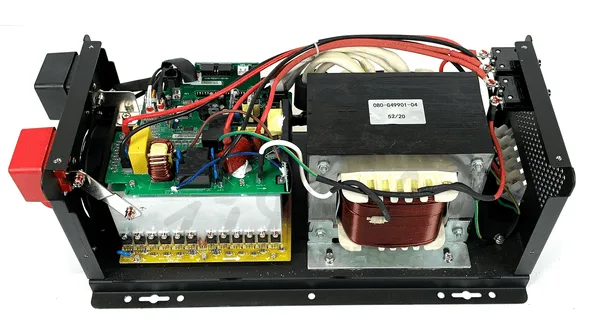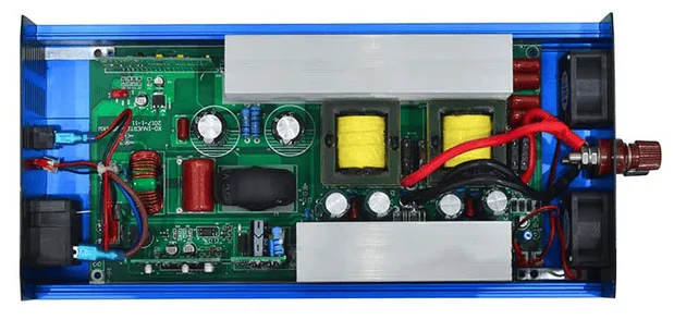 A high frequency inverter uses mosfets to switch electronically. These mosfets need to be cooled and are attached to heatsinks. In the above picture, you can see the two grey heatsinks, but no big transformer.