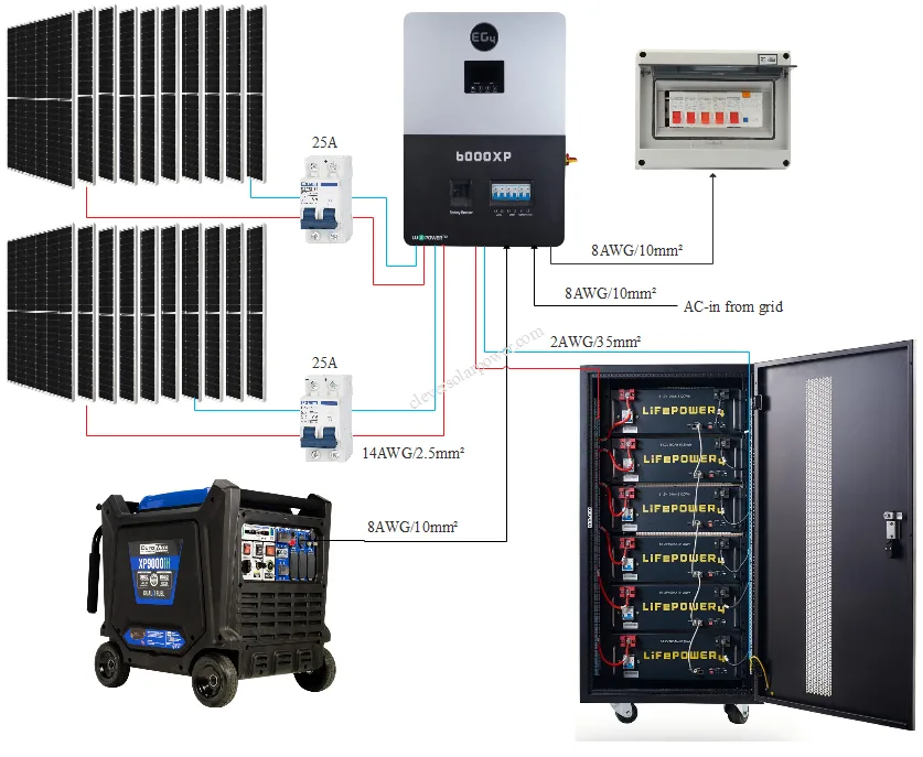 We can have a 10S2P solar panel setup. That is, 10 panels in series are paralleled with another 10, for a total of 20 solar panels, each 415W, for a total of 8,300W of solar. The PV input can take a maximum of 8,000W, so we are just above the maximum, but it won’t damage the MPPT because we are under the max input voltage and the max input current is 17A per MPPT and ours is 13.2A.
