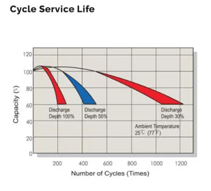 Lead acid batteries have a cycle life of 500 cycles at 50% discharge rate and 77°F (25°C) at 0.2C, as you can see in an image from the Renogy specification sheet: