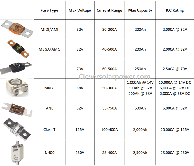 - Fuses: MIDI, MEGA, ANL, T-Class: only buy name brand fuses