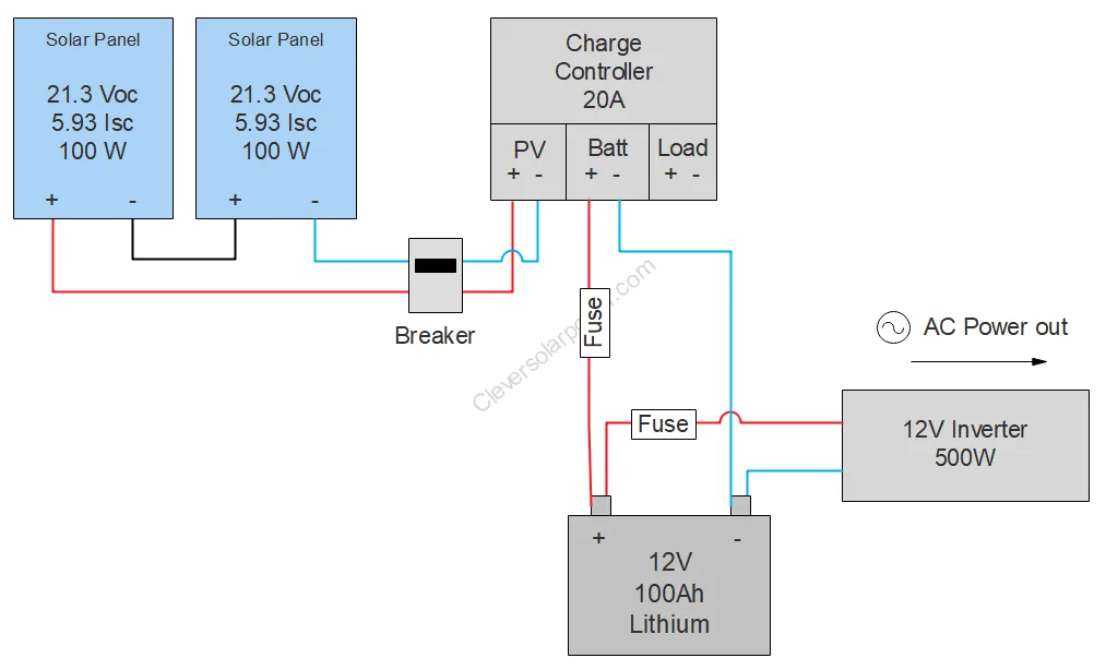 I see that you have fuse’s on the + side of the panel , what size should this be? I’m installing 2 -100 watt panel’s series, going to a Mppt charger controller,voltage 12v/24v rated current 40a,max pv voltage 50v max pv input power 520watt(12v)1040 (24v) I will be running a 12v tv / 12v light’s / and one 12v ex-fan . I have a 20 ft.run from the panel’s to the controller using 6 gauge wire, only 2ft from controller to bat. also should I hook the rv wire that went to the bat. before to the load output of the controller? Thanks so Much for your help, new at this , plan to full time, BLM land.