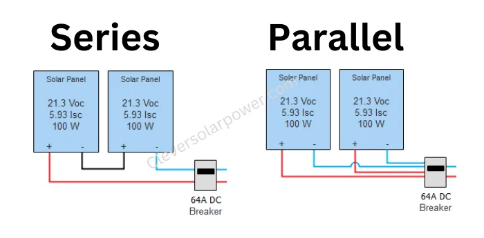 This can be done in series or in parallel. I have written an article about the pros and cons of both of them. You can read it here: Series VS parallel for solar panels (opens in new tab). You can also check out my video about series vs parallel here. Here is the short version: